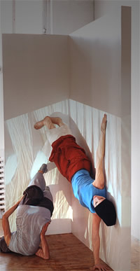 Five female dancers inhabit a corner in a room and its sculptural twin,